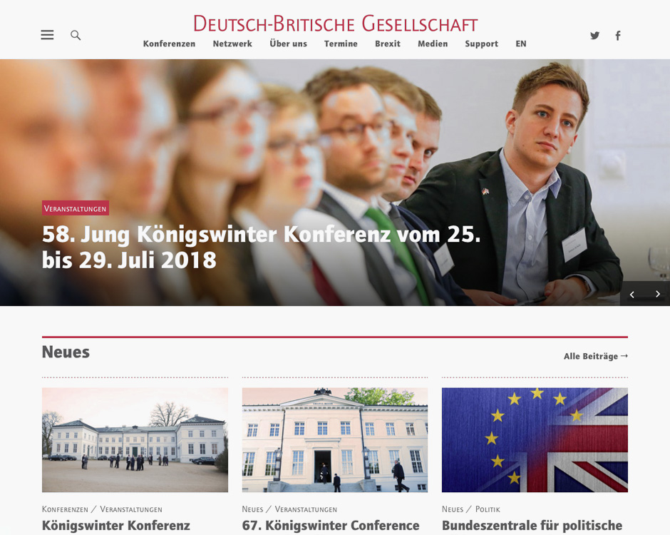 Zur jährlichen Jung Königswinter Konferenz wird eine Microsite entwickeln, die parallel zur Veranstaltung informiert. Die Konferenzreihe möchte junge Menschen aus Deutschland und dem Vereinigten Königreich zusammenzubringen, um das gegenseitige Verständnis und den Austausch von Ideen zu fördern.