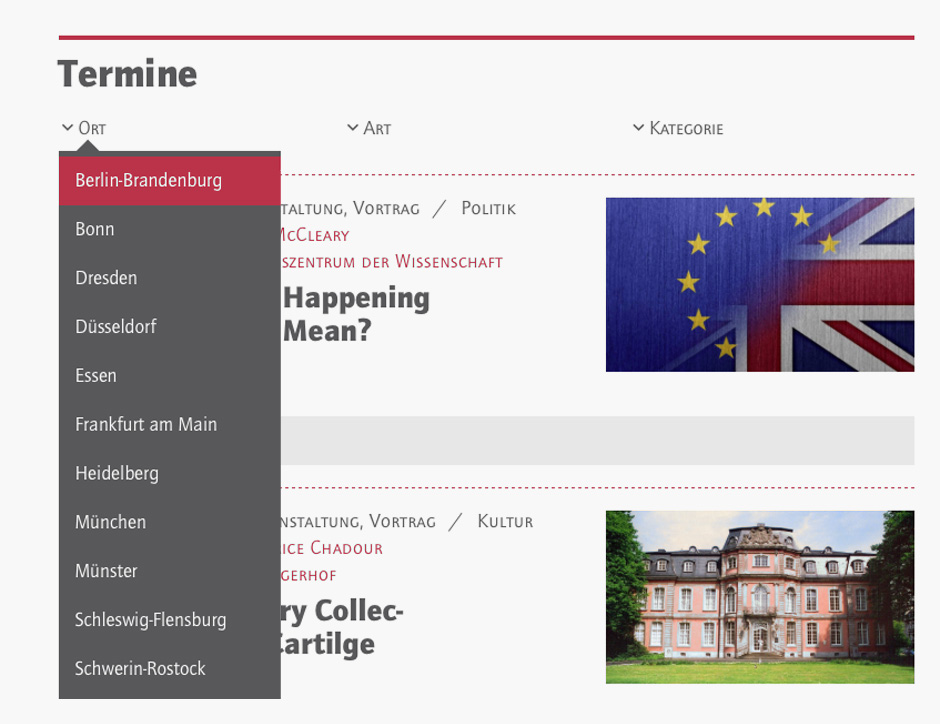 Elf Standorte informieren deutschlandweit über kommende Veranstaltungen und Konferenzen. Über eine Filterfunktion werden passende Events gefunden. Die Pflege der Termine erfolgt standortbezogen über ein entwickeltes Intranet mit verschiedenen Benutzerrollen.